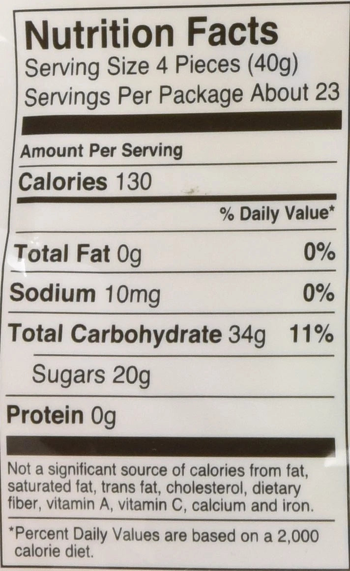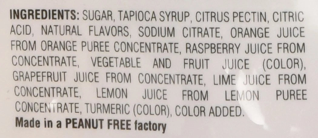 Sunkist fruit candy jelly contains Zero (0) Fat, just 20g of sugar to give it a taste, 130 calories per serving. The ingredients are sugar, natural flavors, sodium citrate, orange juice, raspberry juice from concentrate, vegetable and fruit juice colors. It made in peanut free factory.